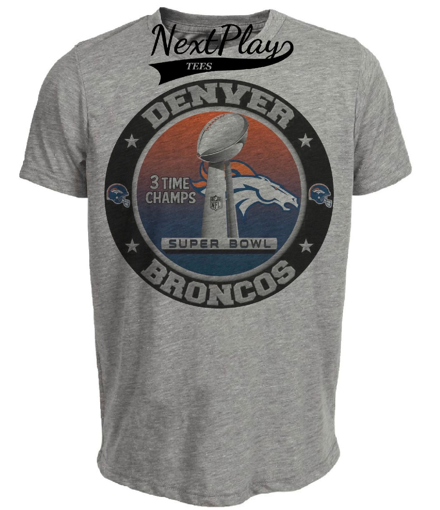 Denver Broncos Retro 3 Time Super Bowl Champs Football 2016 Artwork Heather Gray Sublimated T-Shirt