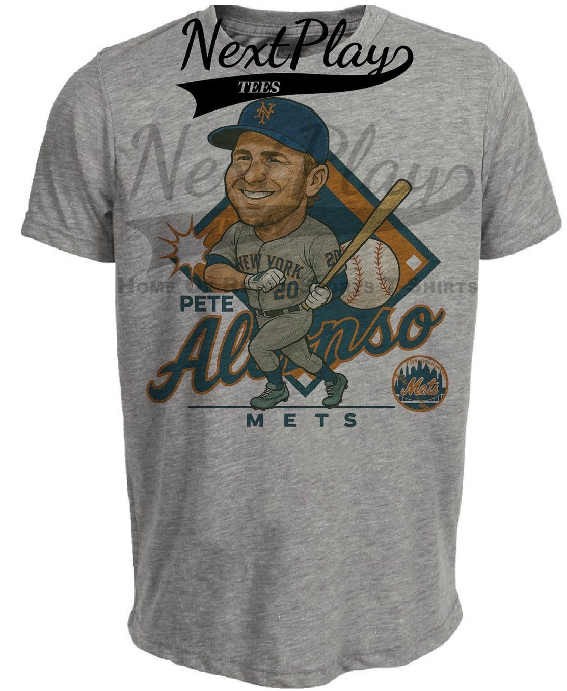 New York Mets Pete Alonso Exclusive Retro Baseball Caricature Artwork Heather Gray Sublimated T-Shirt