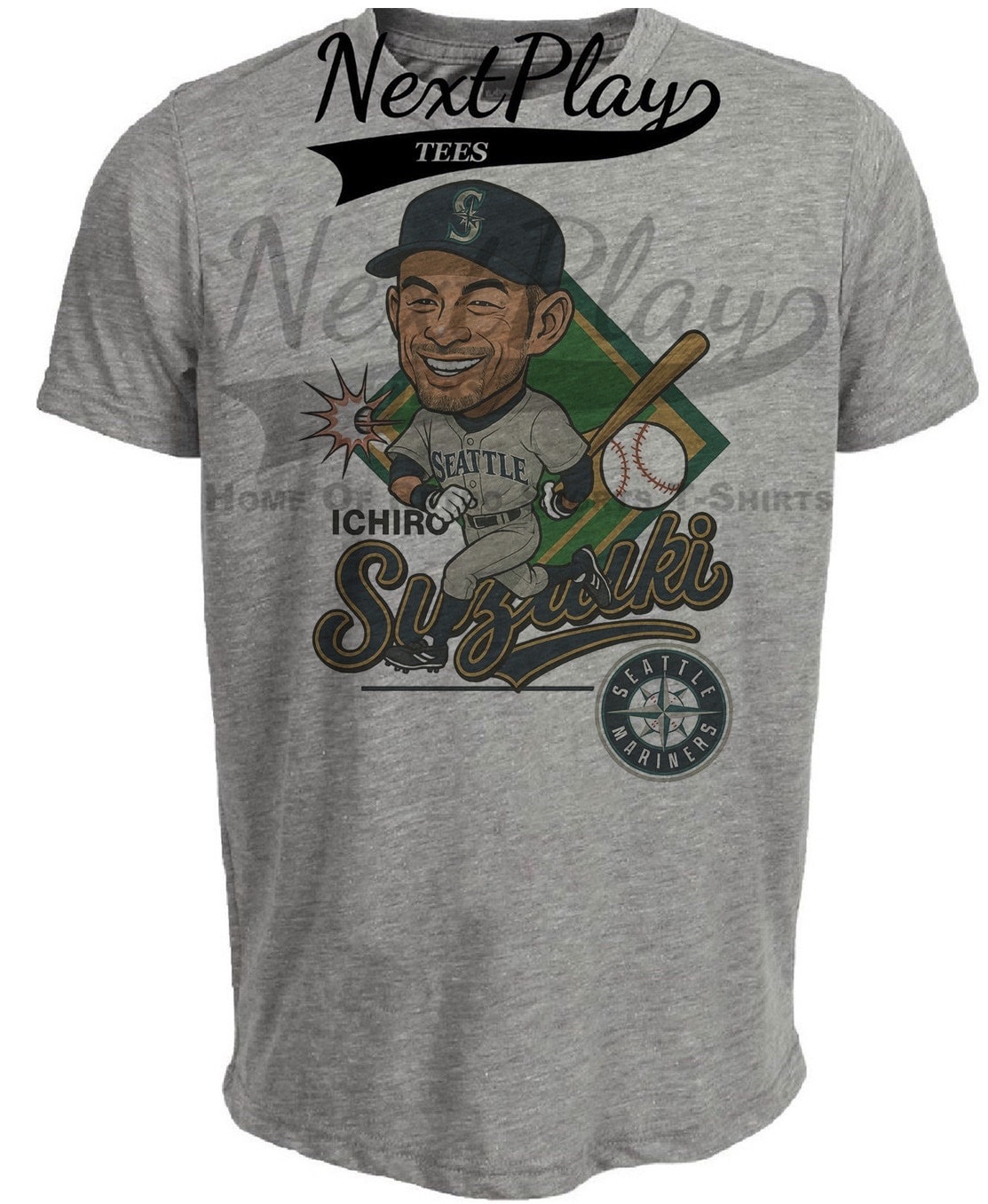 Seattle Mariners Ichiro Suzuki Exclusive Retro Baseball Caricature Artwork Heather Gray Sublimated T-Shirt
