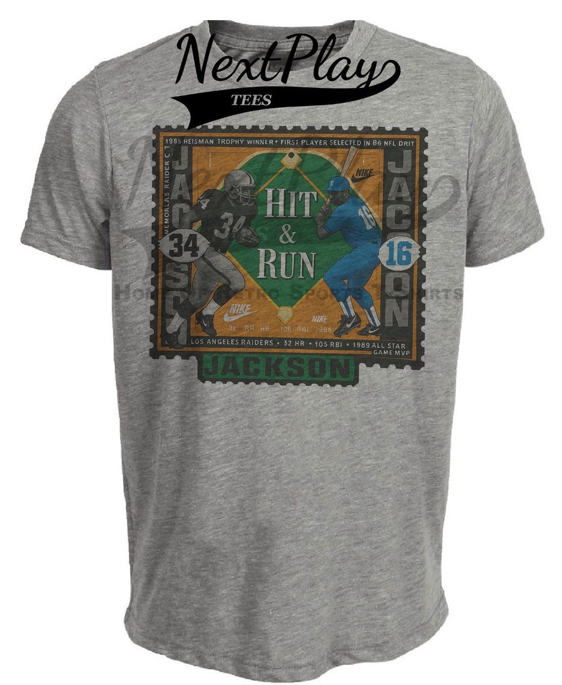 Los Angeles Raiders Kansas City Royals Bo Jackson Retro Hit Run Football Baseball 1990 Artwork Heather Gray Sublimated T-Shirt