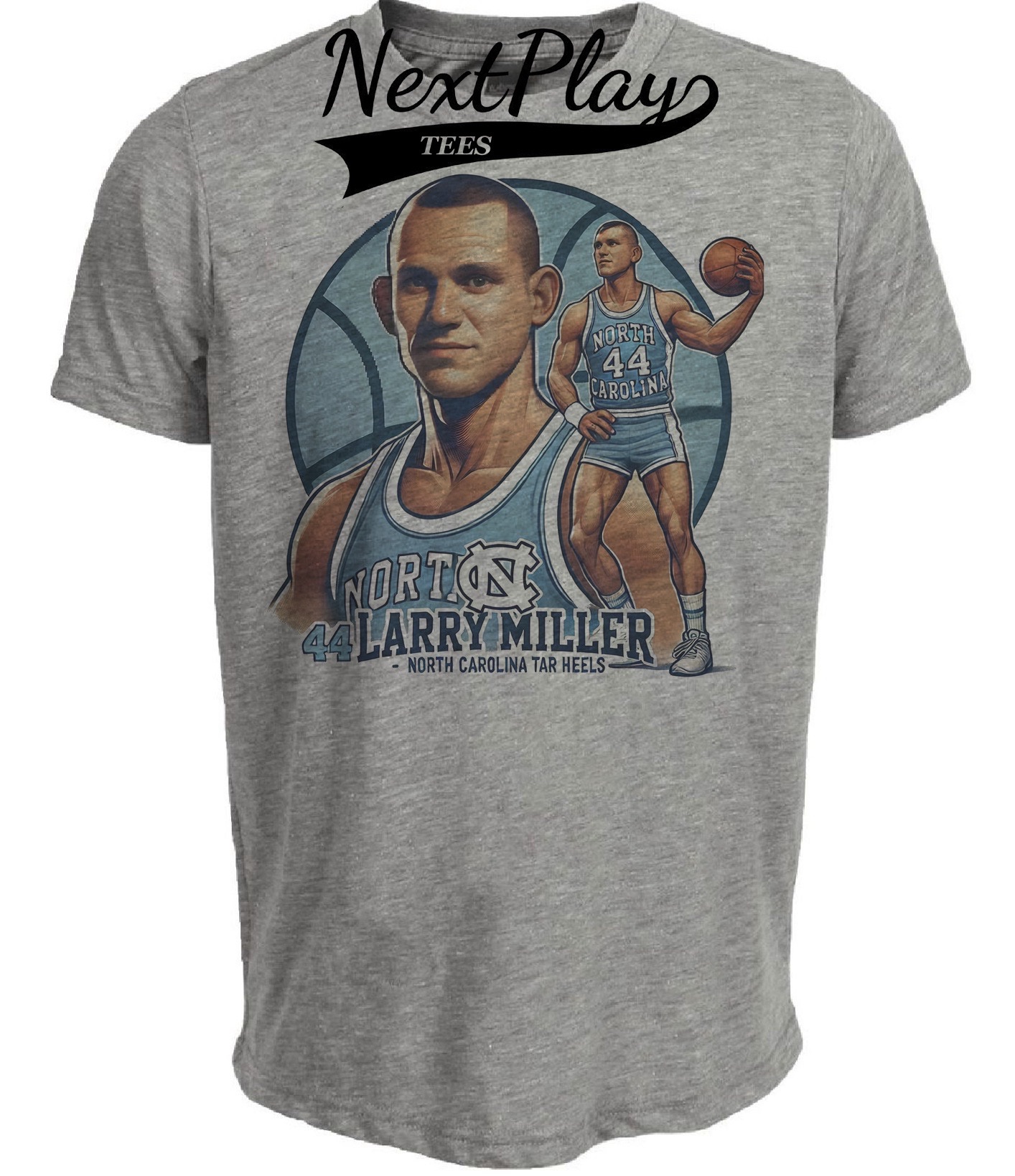 North Carolina Tar Heels Larry Miller Exclusive Retro Basketball 1965 Artwork Heather Gray Sublimated T-Shirt