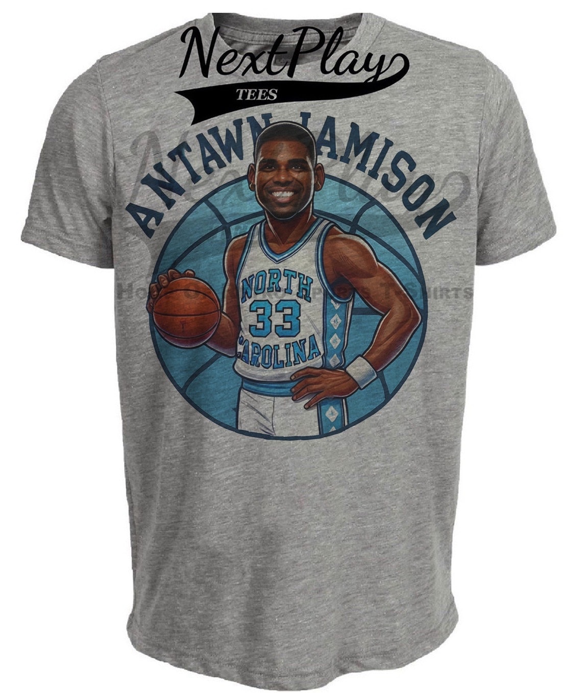 North Carolina Tar Heels Antawn Jamison Exclusive Retro Basketball 1996 Artwork Heather Gray Sublimated T-Shirt