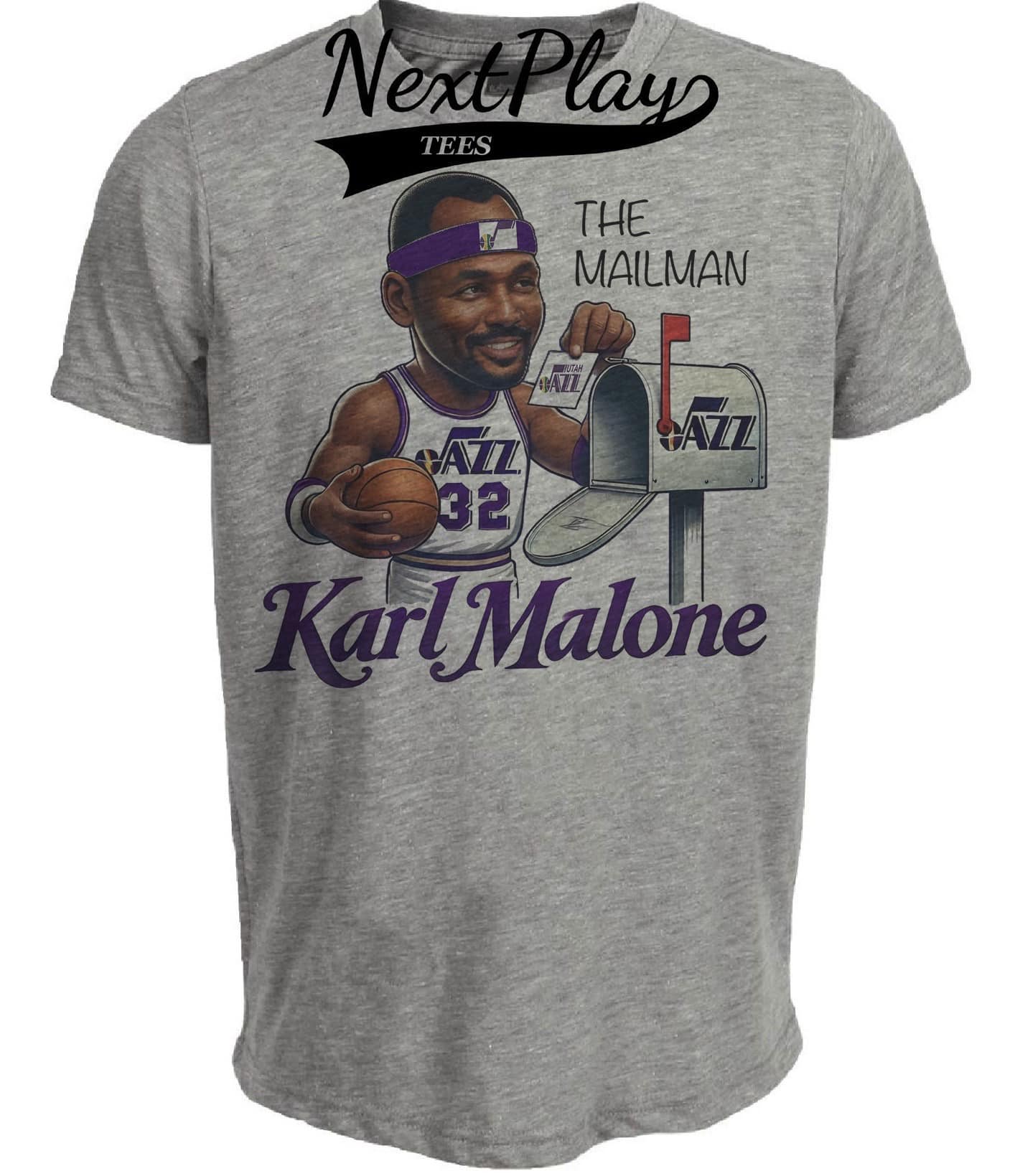 Utah Jazz Karl Malone The Mailman Exclusive Retro Basketball 1987 Artwork Heather Gray Sublimated T-Shirt