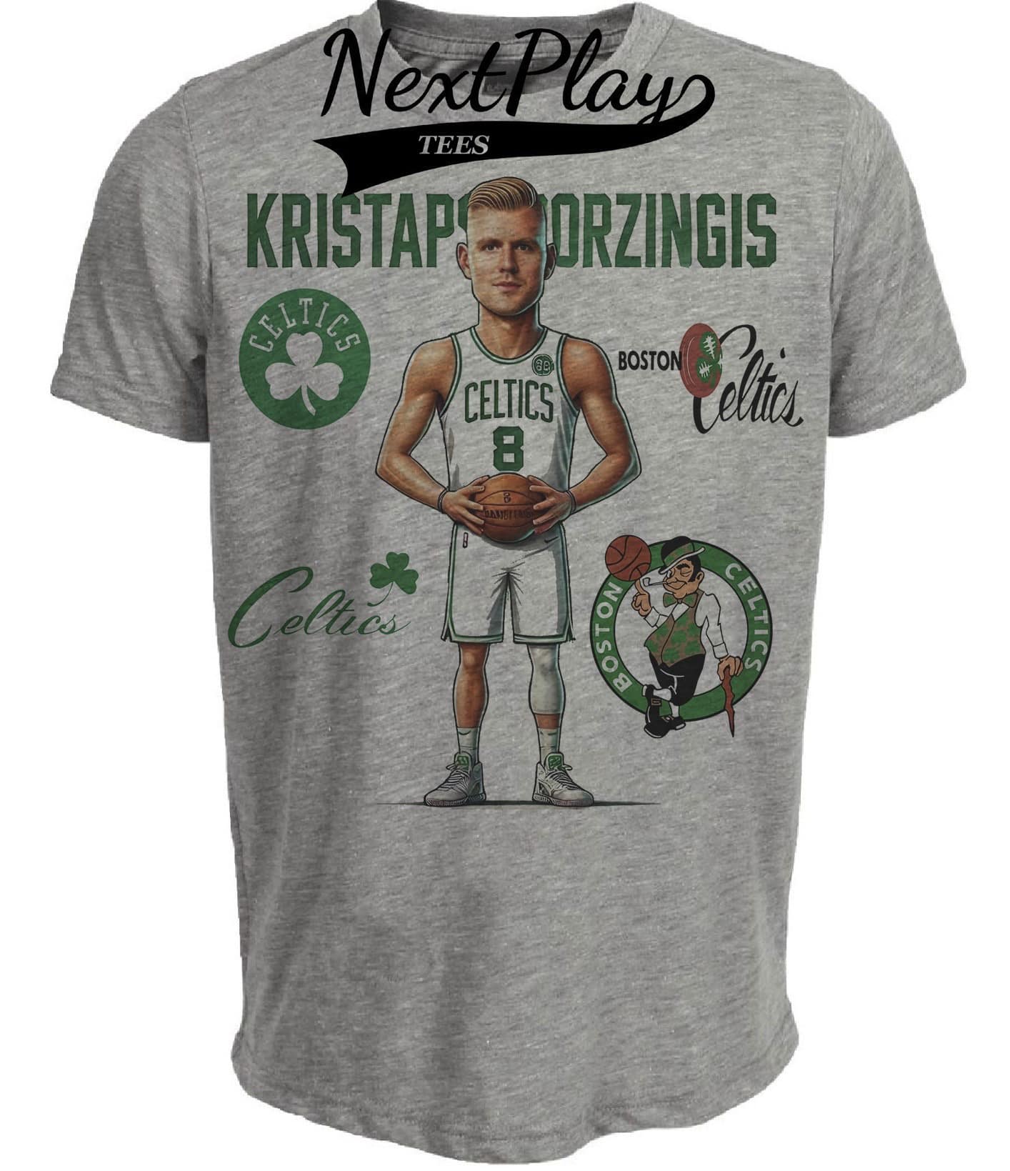 Boston Celtics Kristaps Porzingis Exclusive Retro Basketball Artwork Heather Gray Sublimated T-Shirt