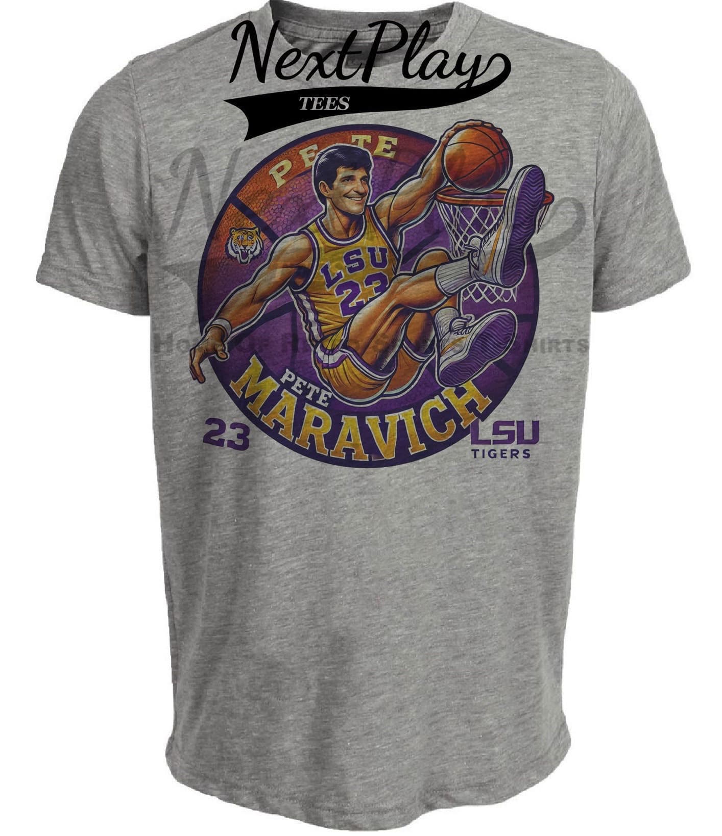 LSU Tigers Pete Maravich Exclusive Retro March Madness Basketball Artwork Heather Gray Sublimated T-Shirt