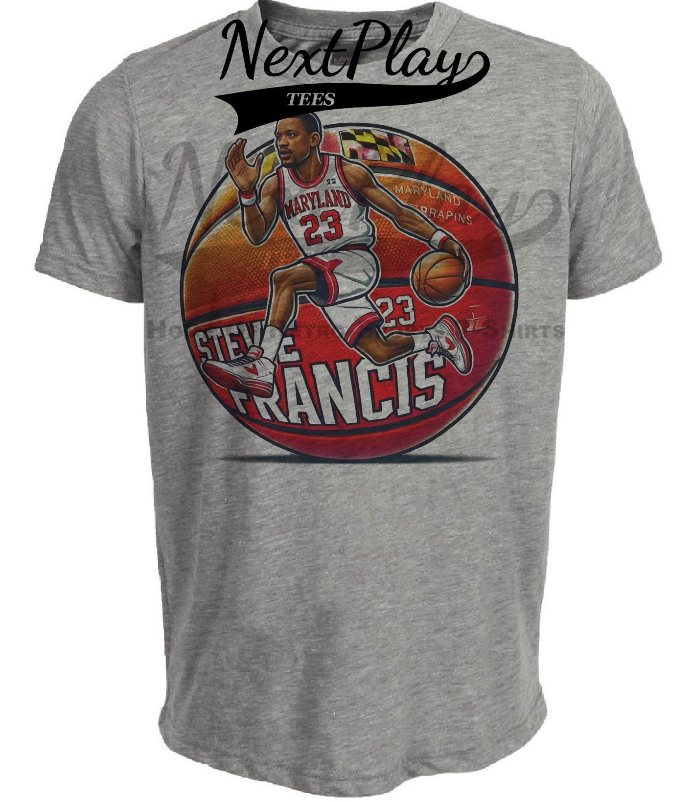 Maryland Terrapins Steve Francis Exclusive Retro March Madness Basketball Artwork Heather Gray Sublimated T-Shirt