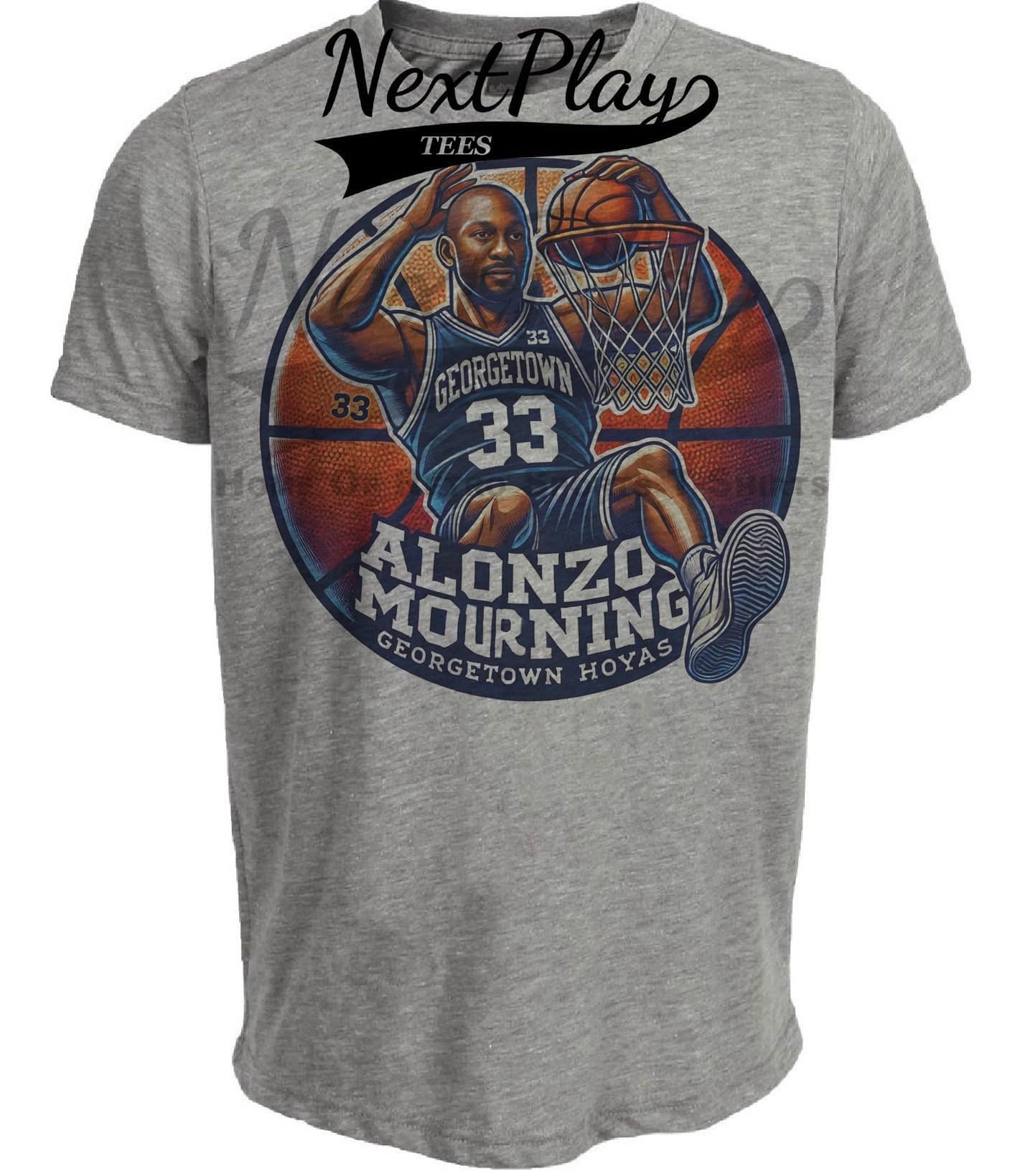 Georgetown Hoyas Alonzo Mourning Exclusive Retro March Madness Basketball Artwork Heather Gray Sublimated T-Shirt
