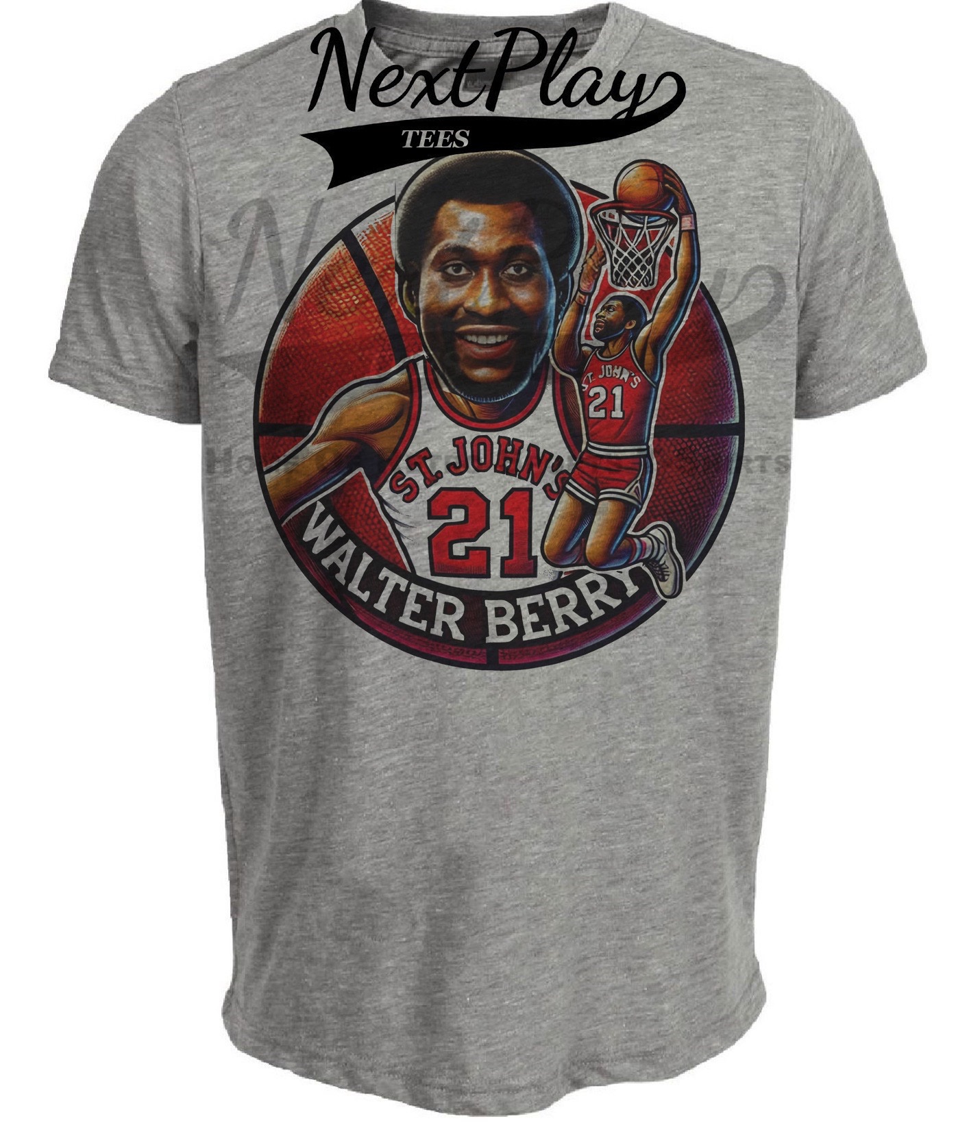 St. John’s Red Storm Walter Berry Exclusive Retro March Madness Basketball Redmen Artwork Heather Gray Sublimated T-Shirt