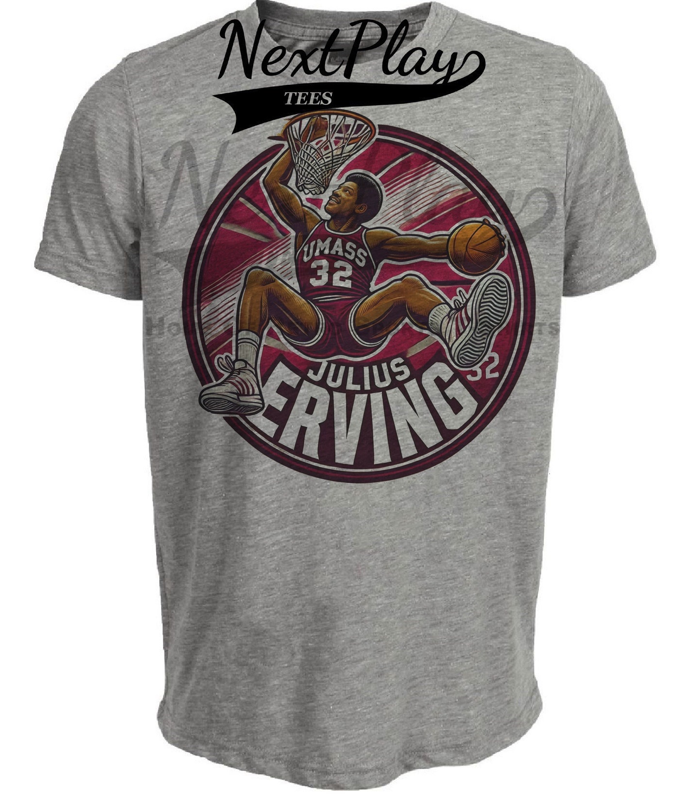 UMass Minutemen Julius Erving Exclusive Retro March Madness Basketball Artwork Heather Gray Sublimated T-Shirt
