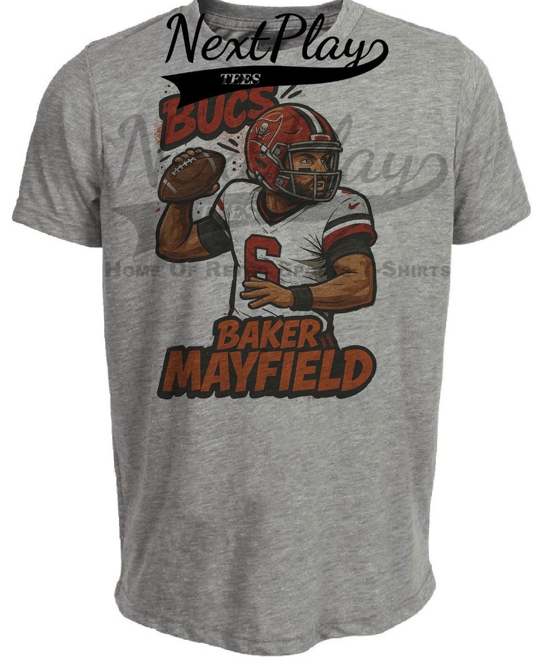 Tampa Bay Buccaneers Baker Mayfield Exclusive Caricature Football Artwork Heather Gray Sublimated T-Shirt