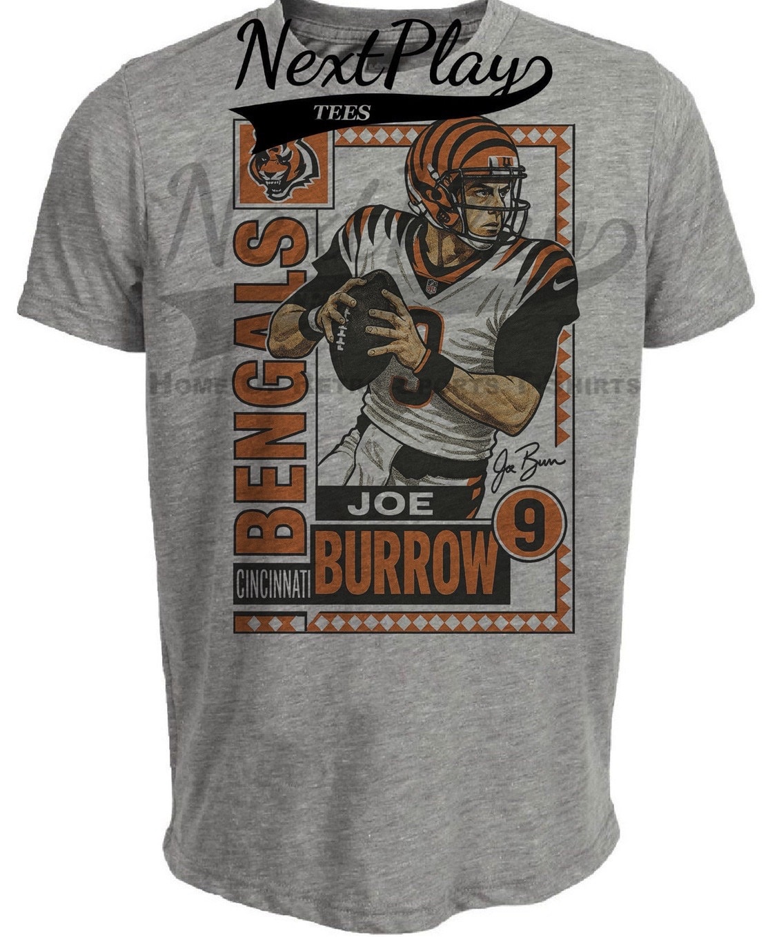 Cincinnati Bengals Joe Burrow Exclusive Retro Football Artwork Heather Gray Sublimated T-Shirt