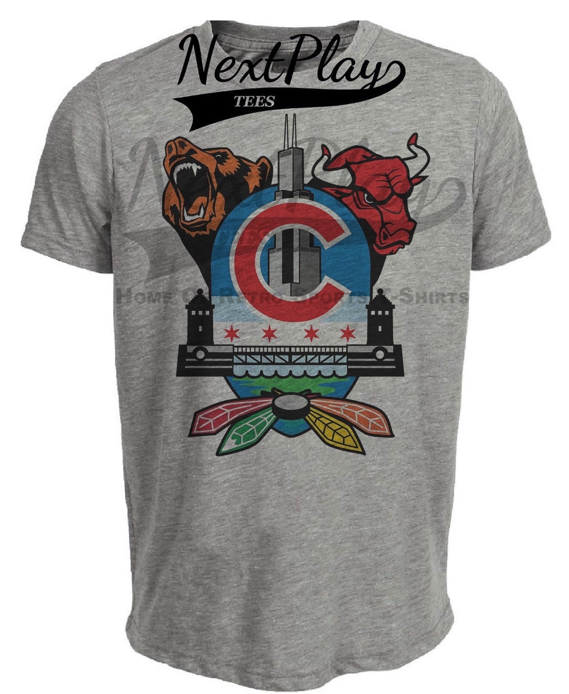 Chicago Bulls Bears Cubs Blackhawks Retro Football Baseball Basketball Hockey Artwork Heather Gray Sublimated T-Shirt