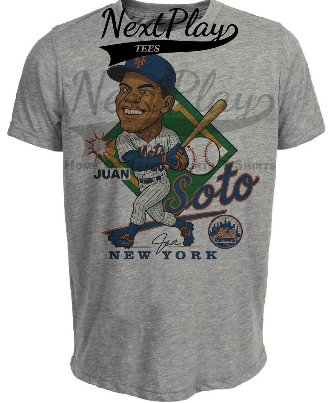 New York Mets Juan Soto Exclusive Retro Baseball Caricature Artwork Heather Gray Sublimated T-Shirt