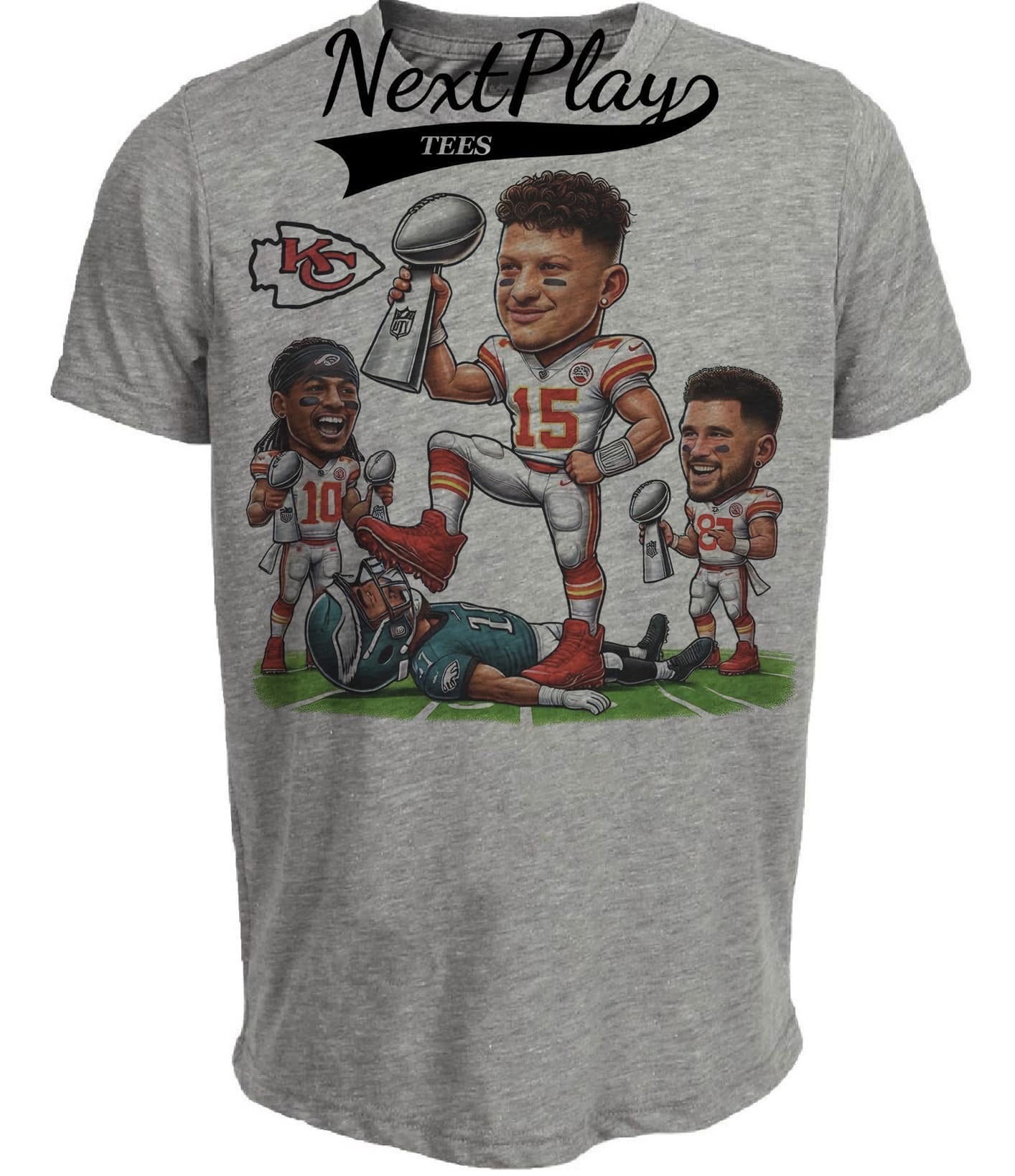 Kansas City Chiefs Mahomes, Pacheco, & Kelce vs. Philadelphia Eagles Exclusive Retro Rivalries Football Super Bowl Artwork Heather Gray Sublimated T-Shirt