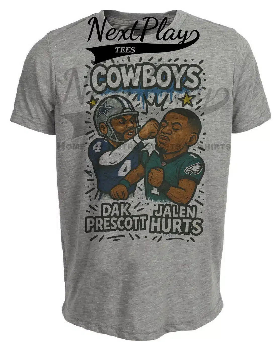 Dallas Cowboys Dak Prescott vs. Philadelphia Eagles Jalen Hurts Exclusive Retro Rivalries Football Artwork Heather Gray Sublimated T-Shirt