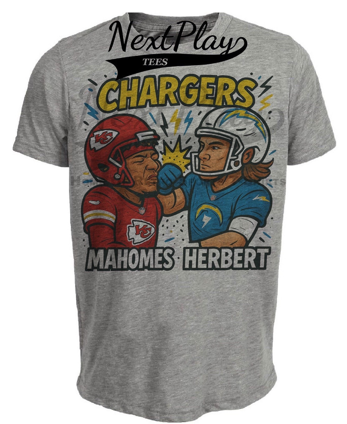 Los Angeles Chargers Justin Herbert vs. Kansas City Chiefs Patrick Mahomes Exclusive Retro Rivalries Football Artwork Heather Gray Sublimated T-Shirt