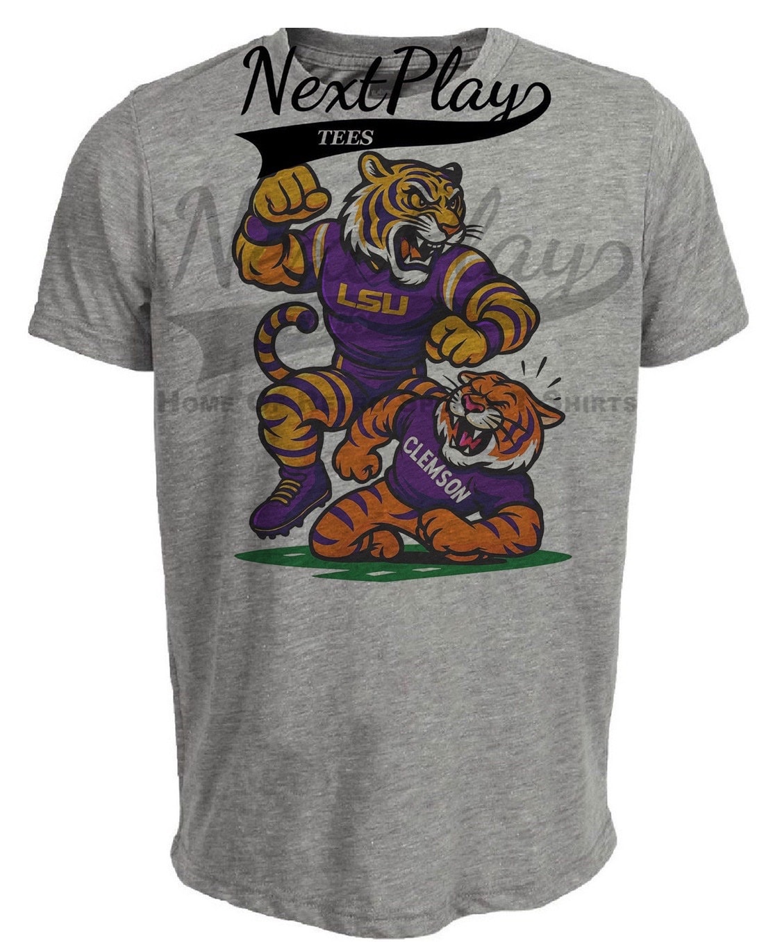LSU Tigers vs. Clemson Tigers Exclusive Retro Rivals Football Artwork Heather Gray Sublimated T-Shirt