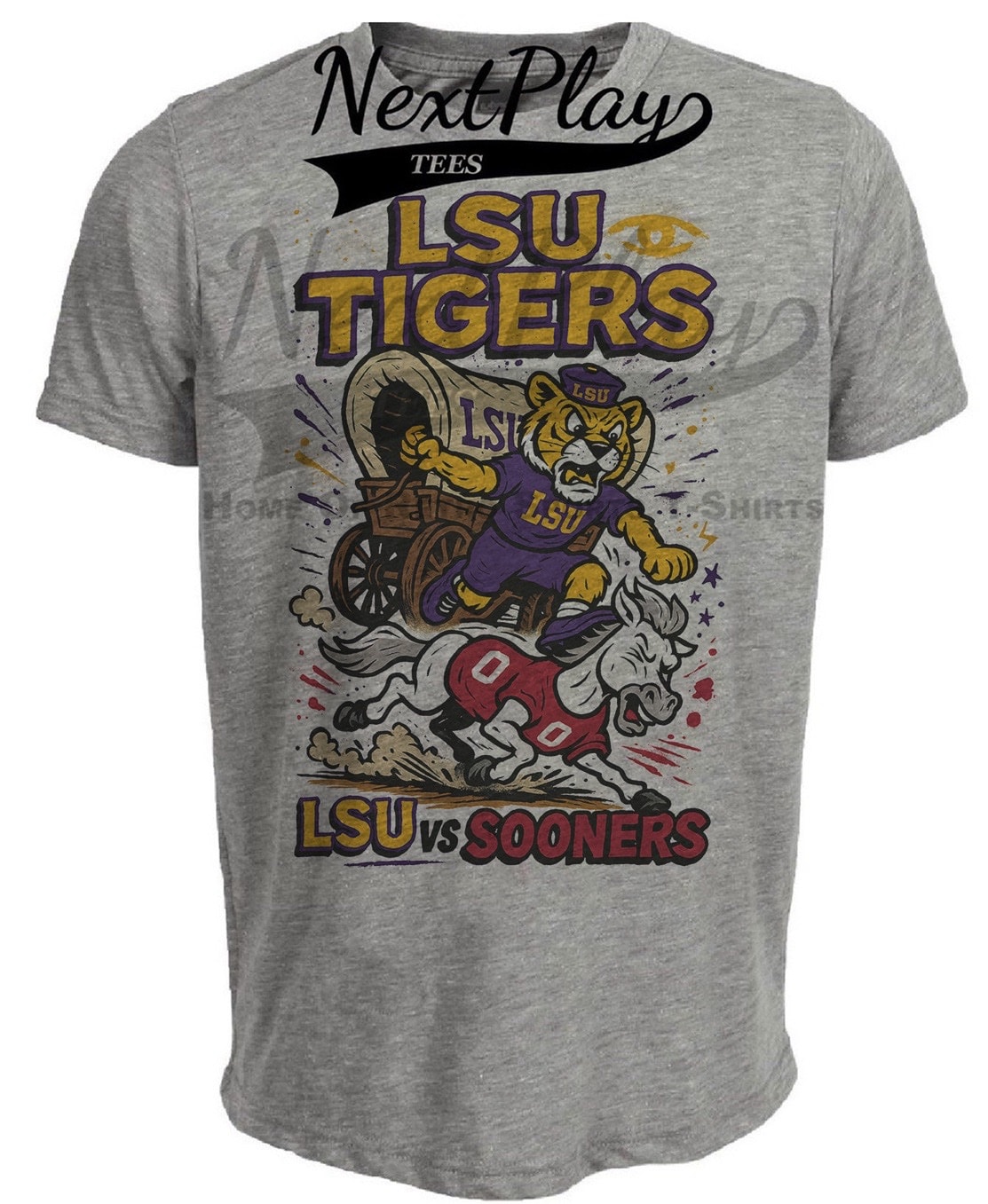LSU Tigers vs. Oklahoma Sooners Exclusive Retro Rivals Football Artwork Heather Gray Sublimated T-Shirt