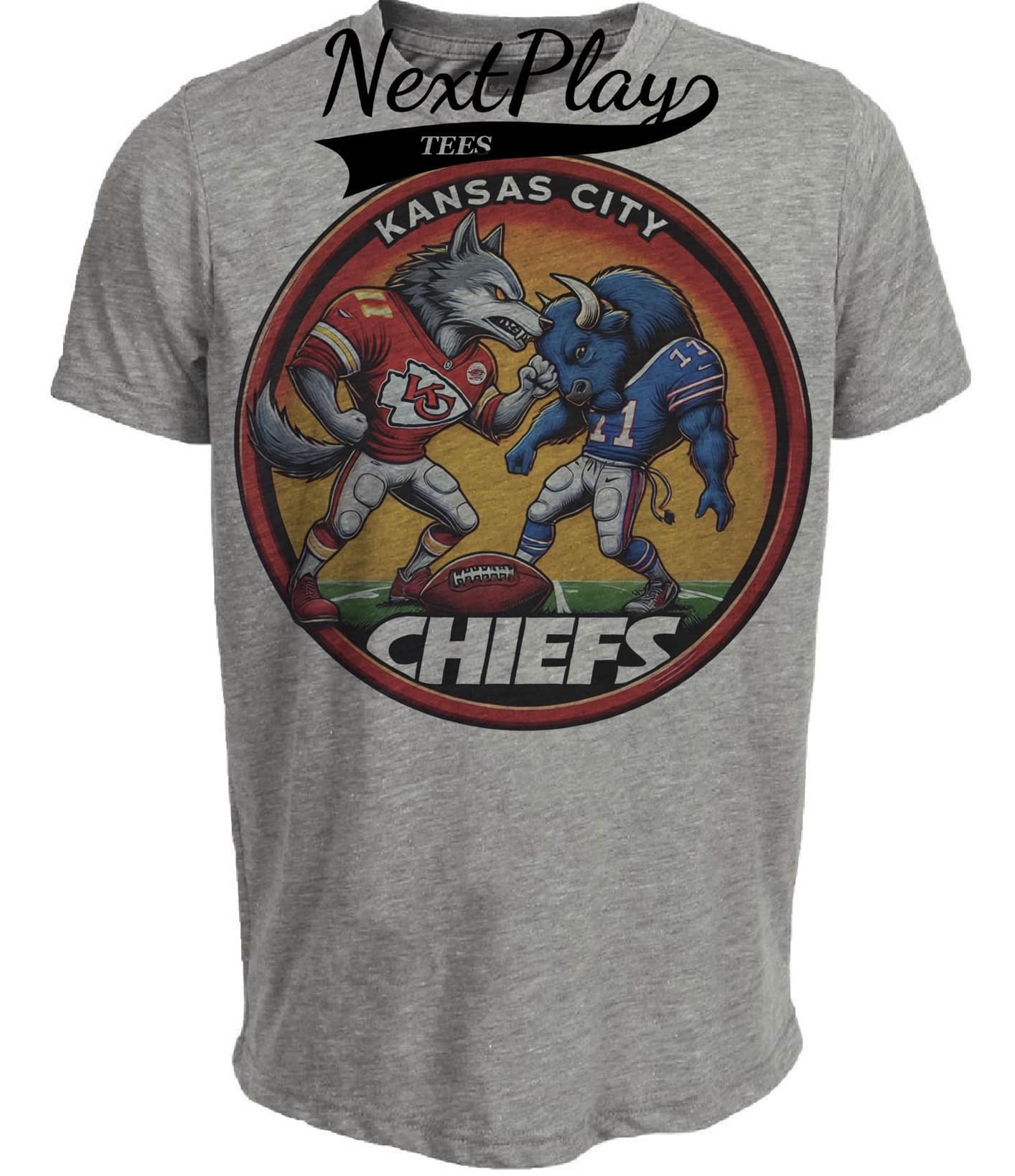 Kansas City Chiefs vs. Buffalo Bills Exclusive Retro Rivalries Football Circle Artwork Heather Gray Sublimated T-Shirt
