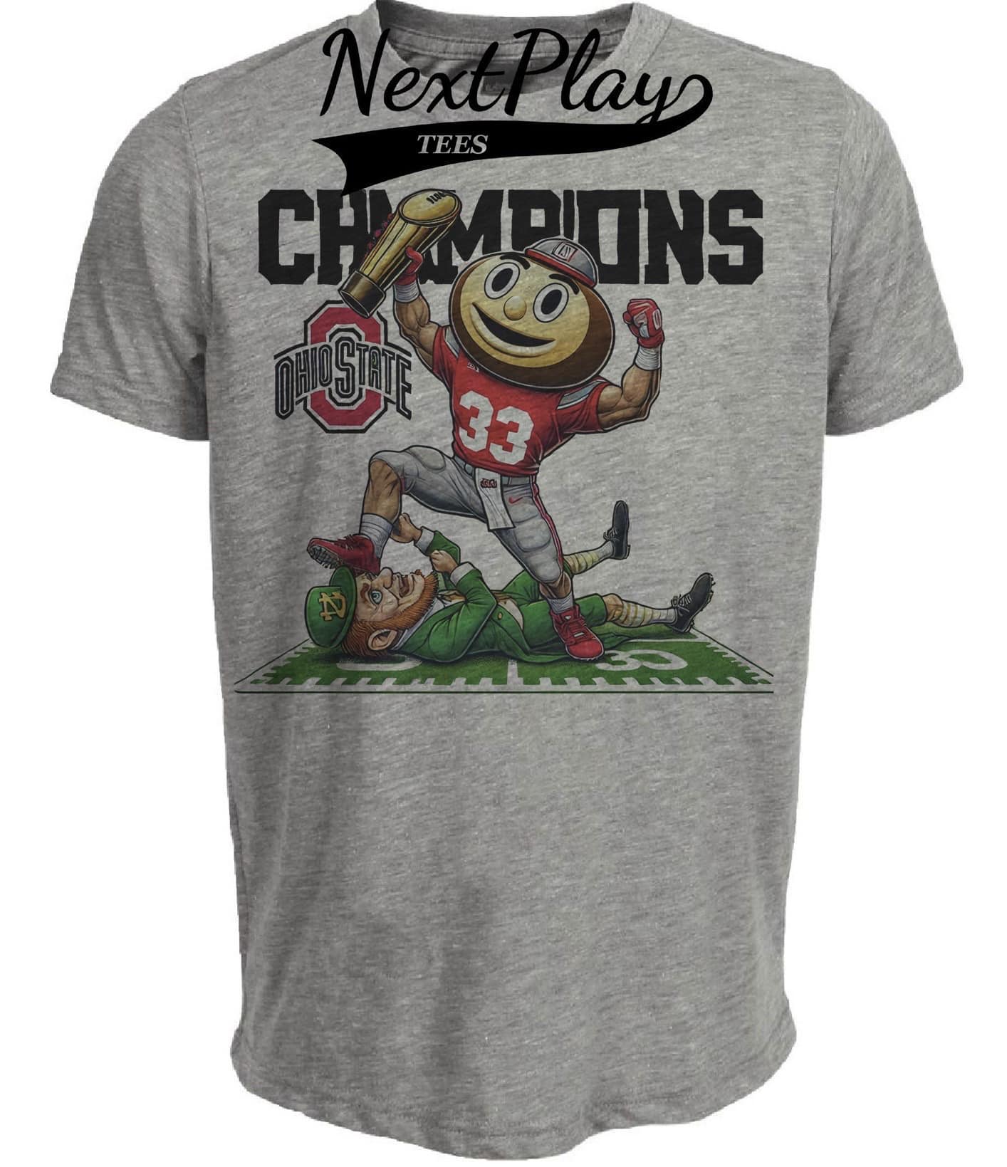 Ohio State Buckeyes vs. Notre Dame Irish Exclusive Retro Rivalries National Football Champions Stomp Artwork Heather Gray Sublimated T-Shirt