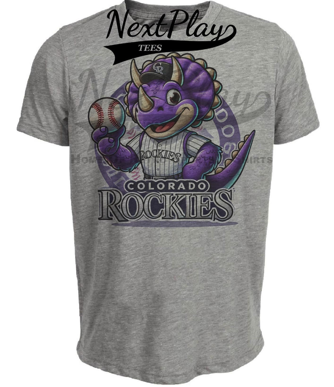Colorado Rockies Exclusive Retro Baseball Mascot Artwork Heather Gray Sublimated T-Shirt