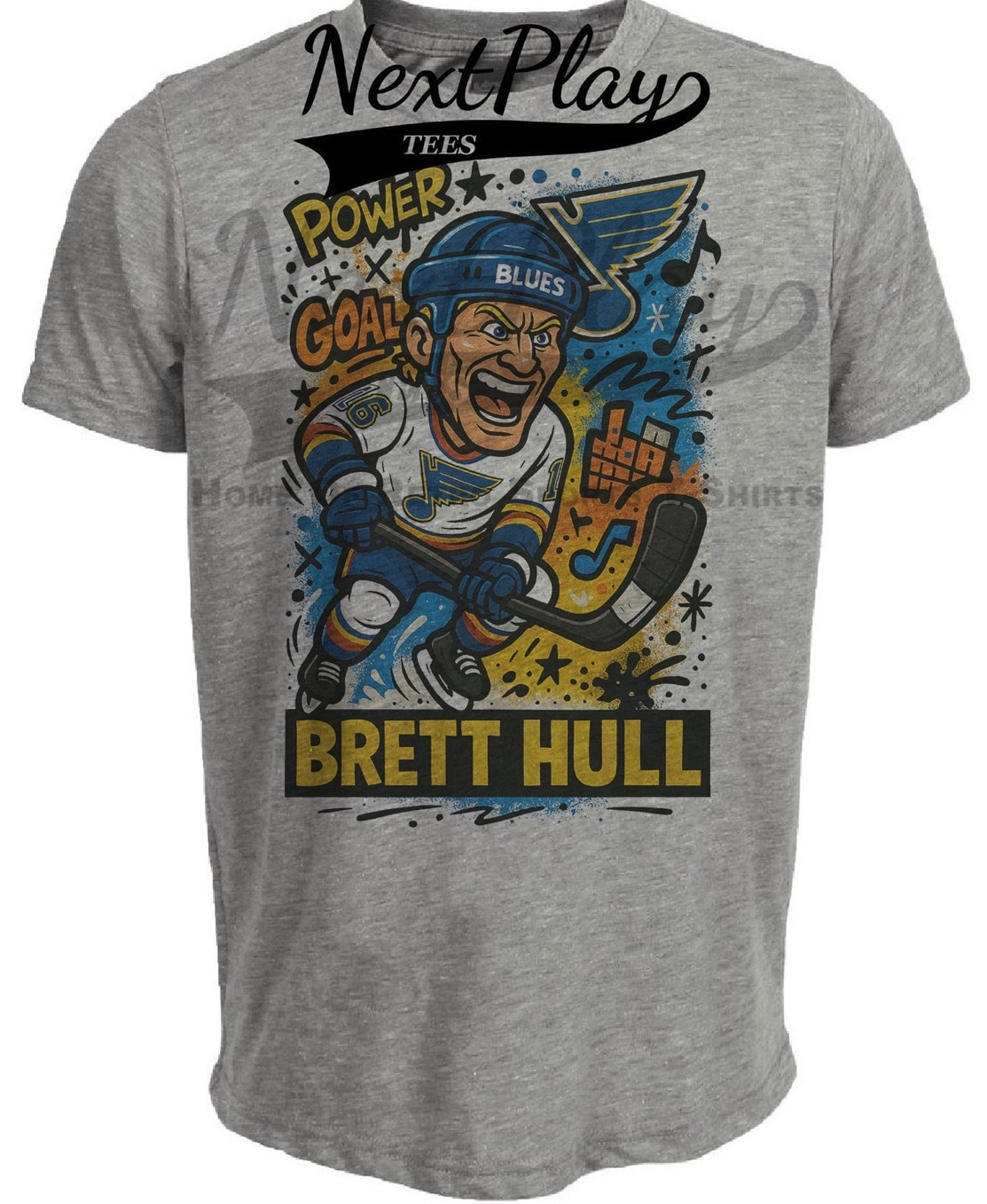 St. Louis Blues Brett Hull Caricature Exclusive Retro Hockey Artwork Heather Gray Sublimated T-Shirt