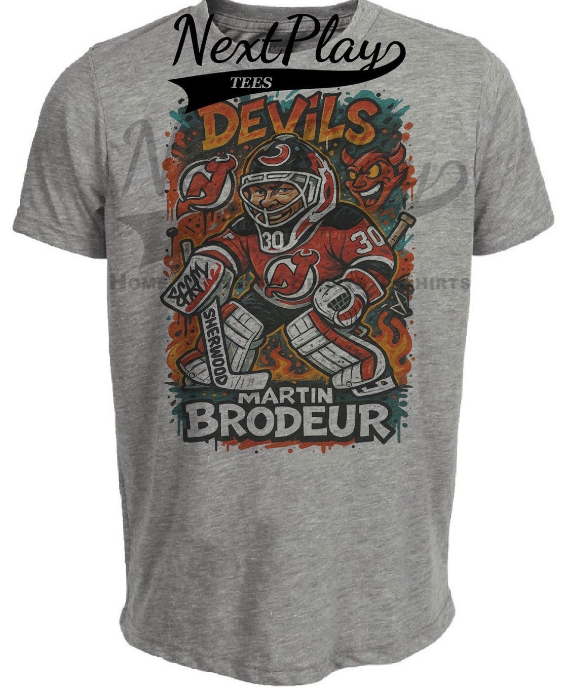 New Jersey Devils Martin Brodeur Caricature Exclusive Retro Hockey Artwork Heather Gray Sublimated T-Shirt