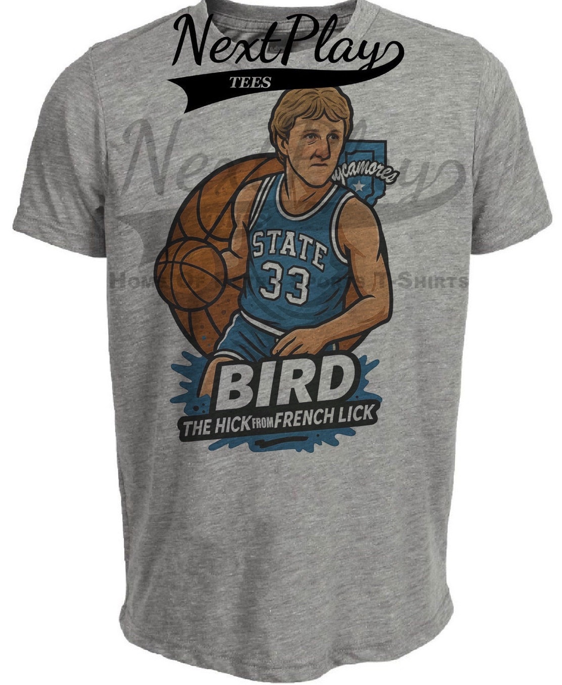 Indiana State Sycamores Larry Bird Hick From French Lick Exclusive Caricature Basketball Artwork Heather Gray Sublimated T-Shirt