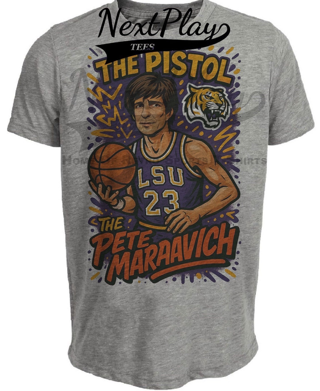 LSU Tigers Pistol Pete Maravich Exclusive Caricature Basketball Artwork Heather Gray Sublimated T-Shirt
