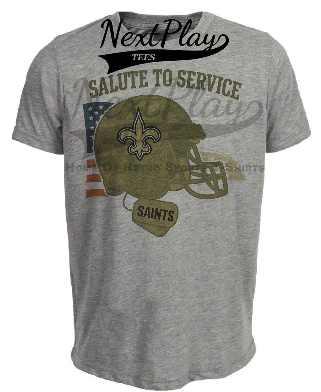 New Orleans Saints Exclusive Retro Football Service Salute Artwork Heather Gray Sublimated T-Shirt