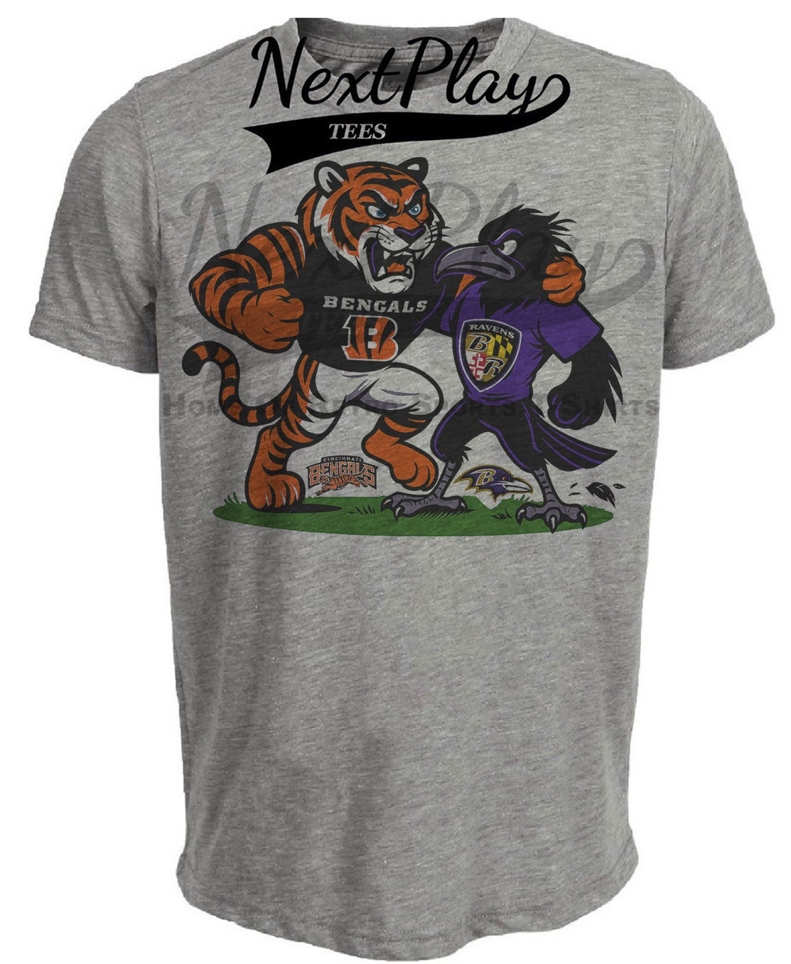 Cincinnati Bengals vs. Baltimore Ravens Retro Rivalries Football Artwork Heather Gray Sublimated T-Shirt