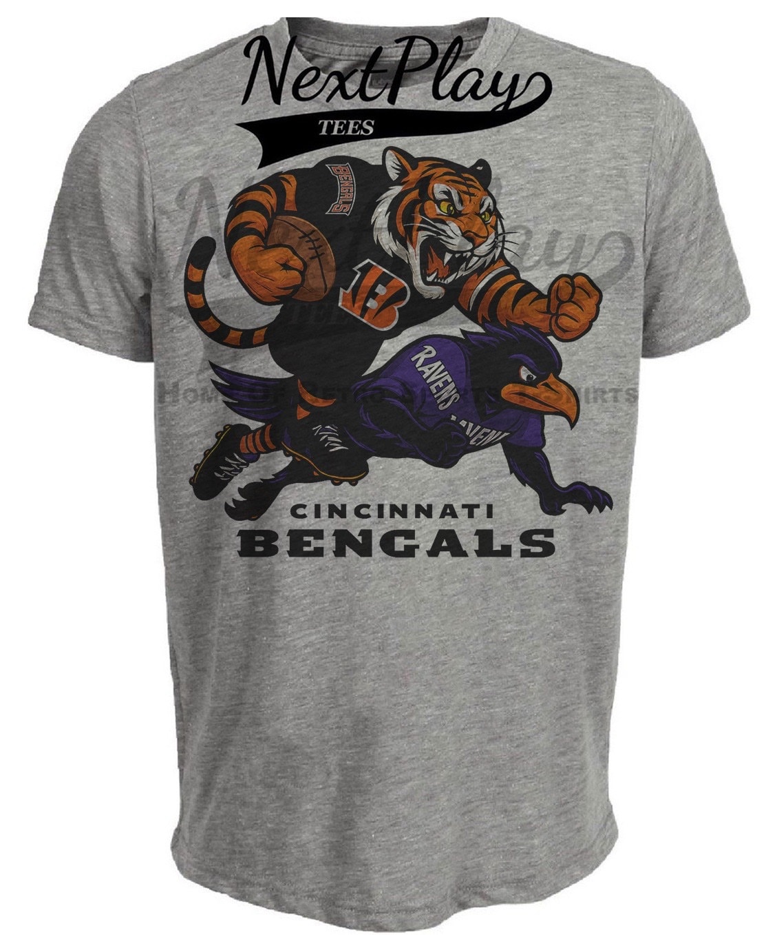 Cincinnati Bengals vs. Baltimore Ravens Retro Rivals Football Artwork Heather Gray Sublimated T-Shirt