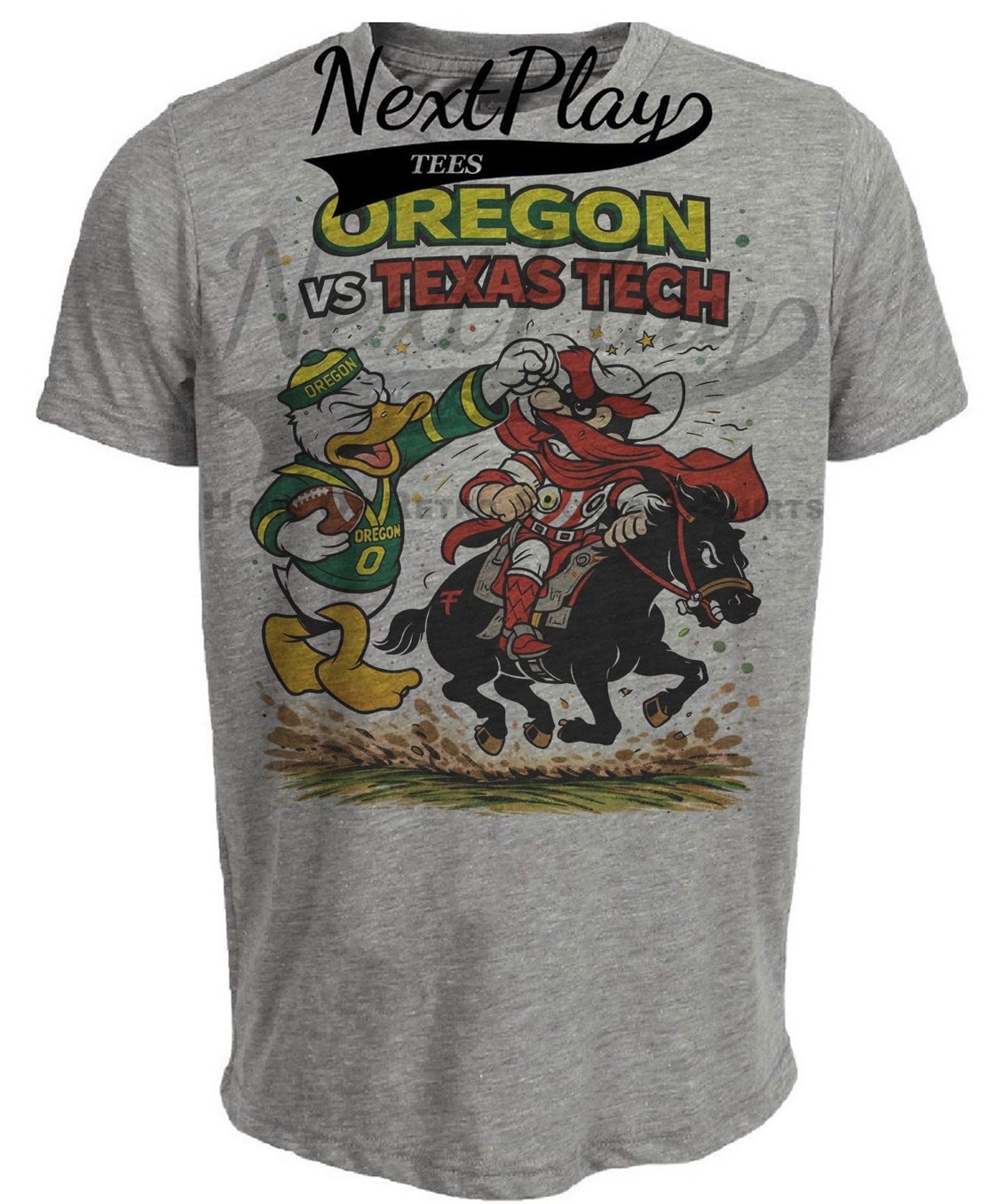 Oregon Ducks vs. Texas Tech Red Raiders Retro Rivalries Football Artwork Heather Gray Sublimated T-Shirt