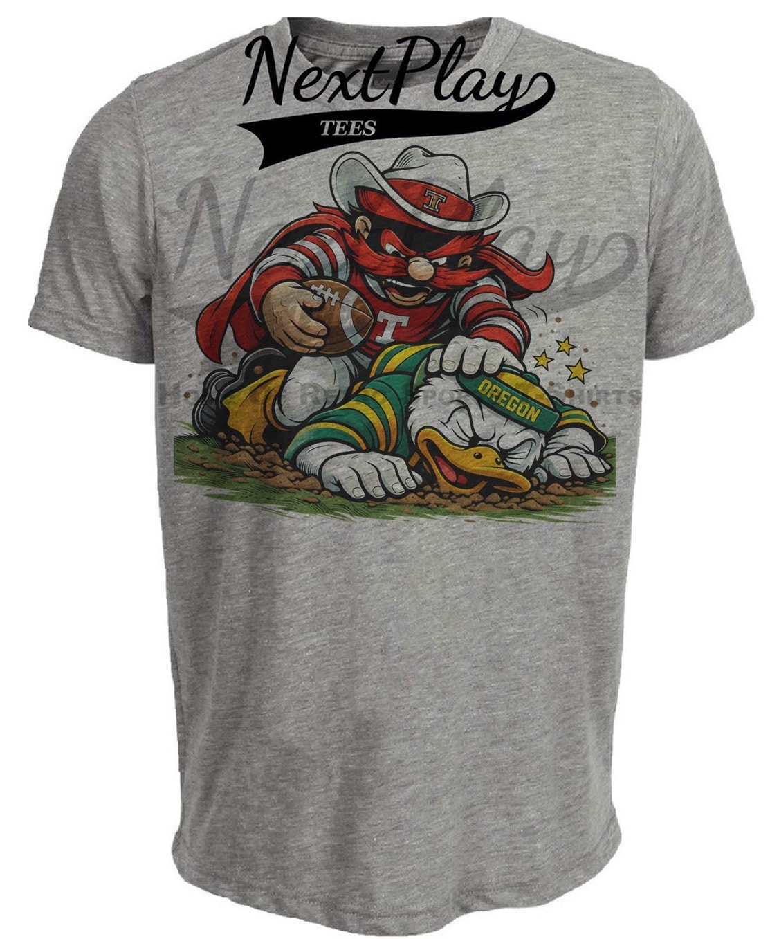 Texas Tech Red Raiders vs. Oregon Ducks Playoffs Retro Rivalries Football Artwork Heather Gray Sublimated T-Shirt