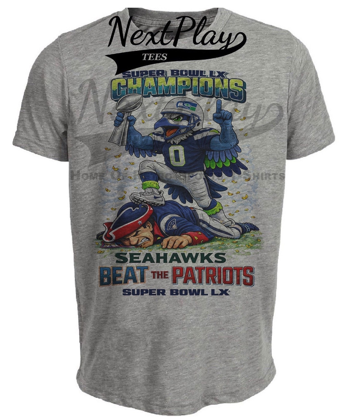 Seattle Seahawks vs. New England Patriots Super Bowl LX Champs Football Gray Sublimated T-Shirt