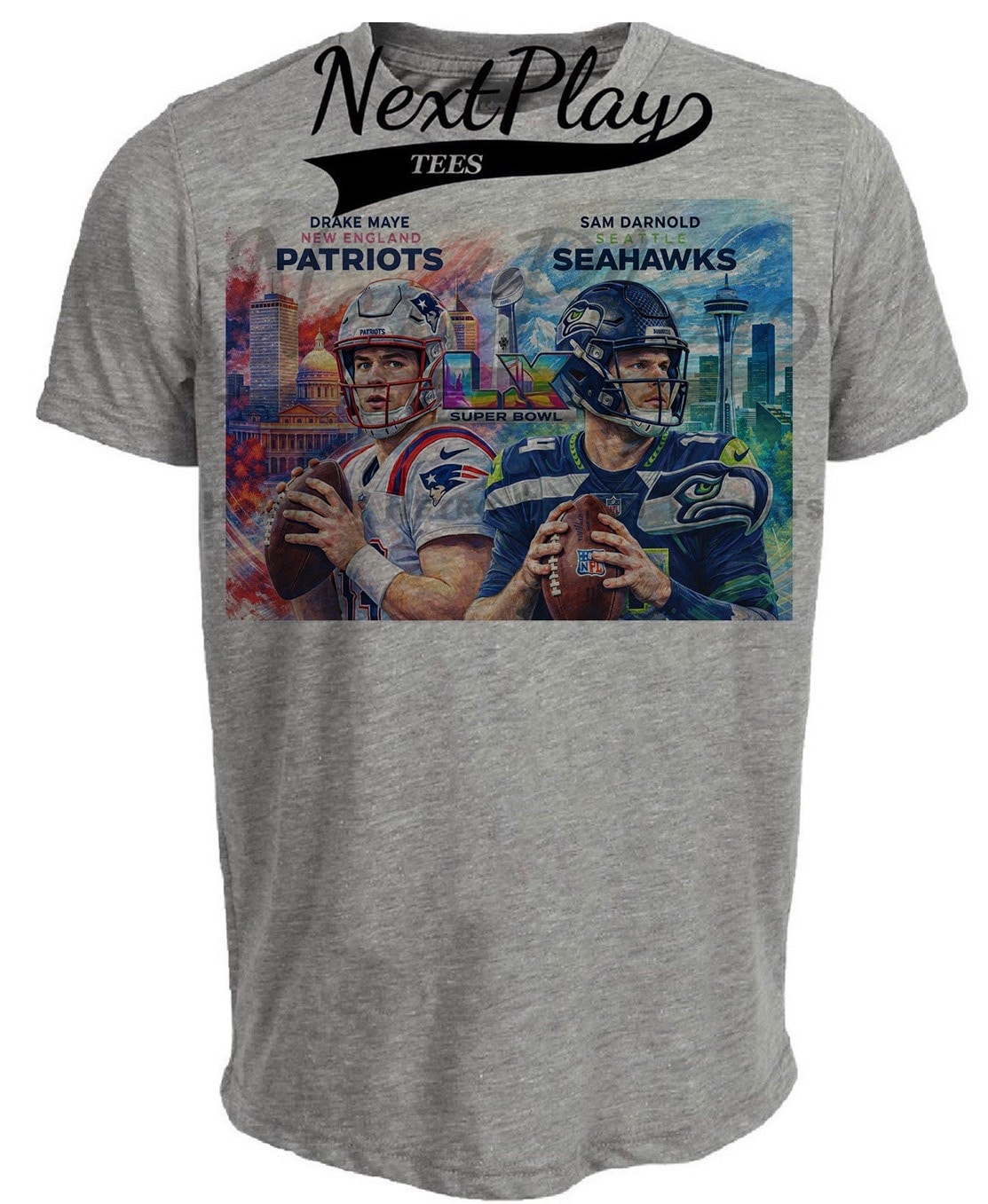 Super Bowl LX QB Rivals Patriots Drake Maye vs. Seahawks Sam Darnold Football Gray Sublimated T-Shirt