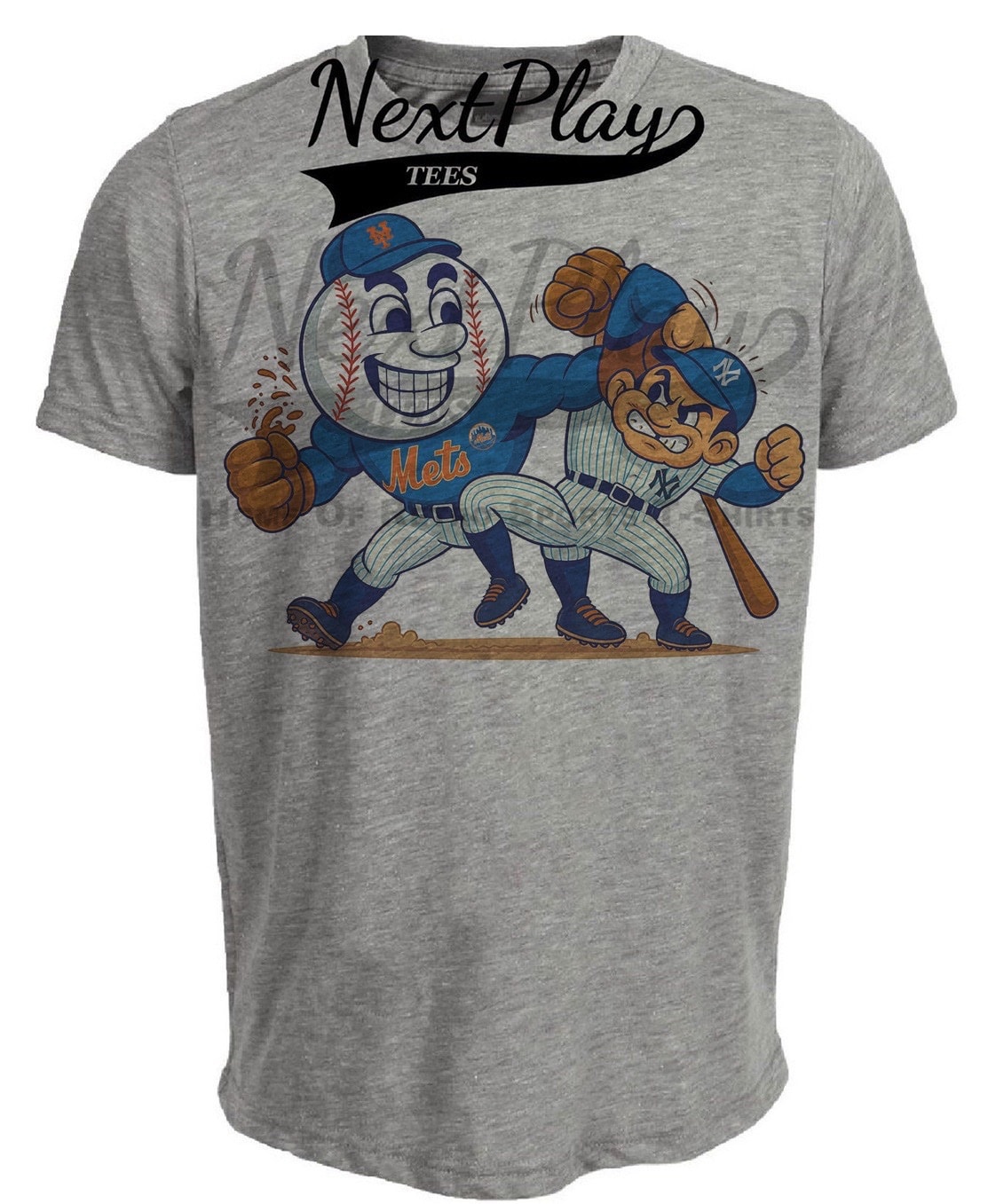 New York Mets vs. New York Yankees Retro Rivalry Mr. Met Baseball 1998 Artwork Heather Gray Sublimated T-Shirt