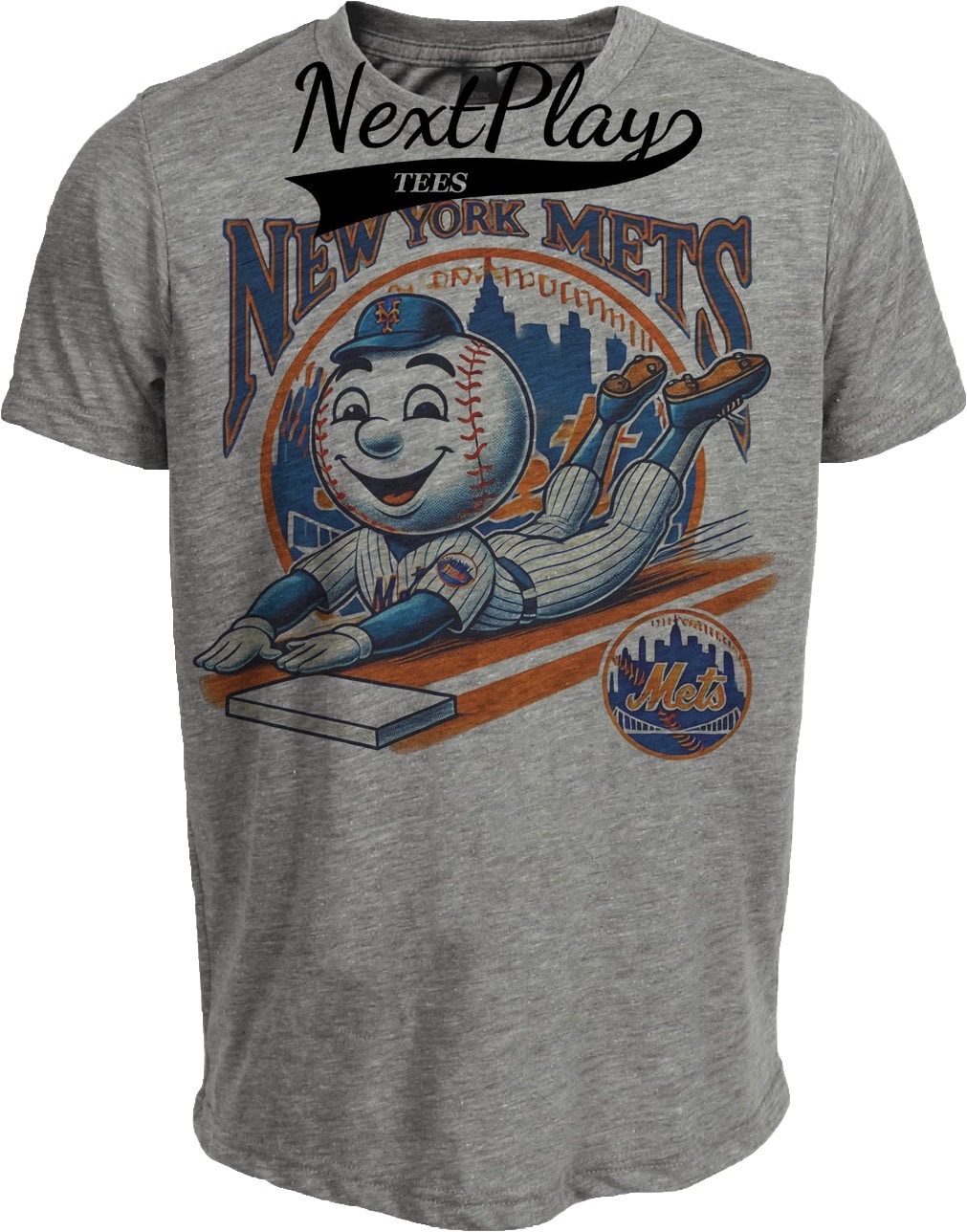 New York Mets Exclusive Mr. Met Sliding Retro Baseball Artwork Heather Gray Sublimated T-Shirt